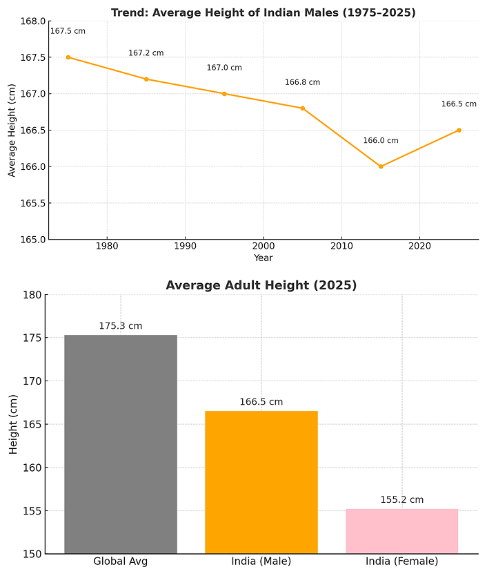 In the last 50 years, the average height of Indian males has seen a worrying drop — from 167.5 cm in 1975 to just 166.5 cm in 2025. Globally, the average male height is 175.3 cm, leaving India significantly behind. This isn’t simply about genetics — it’s a clear sign of nutritional gaps during key childhood years, especially between ages 7 to 12, when the body’s growth potential is at its peak.